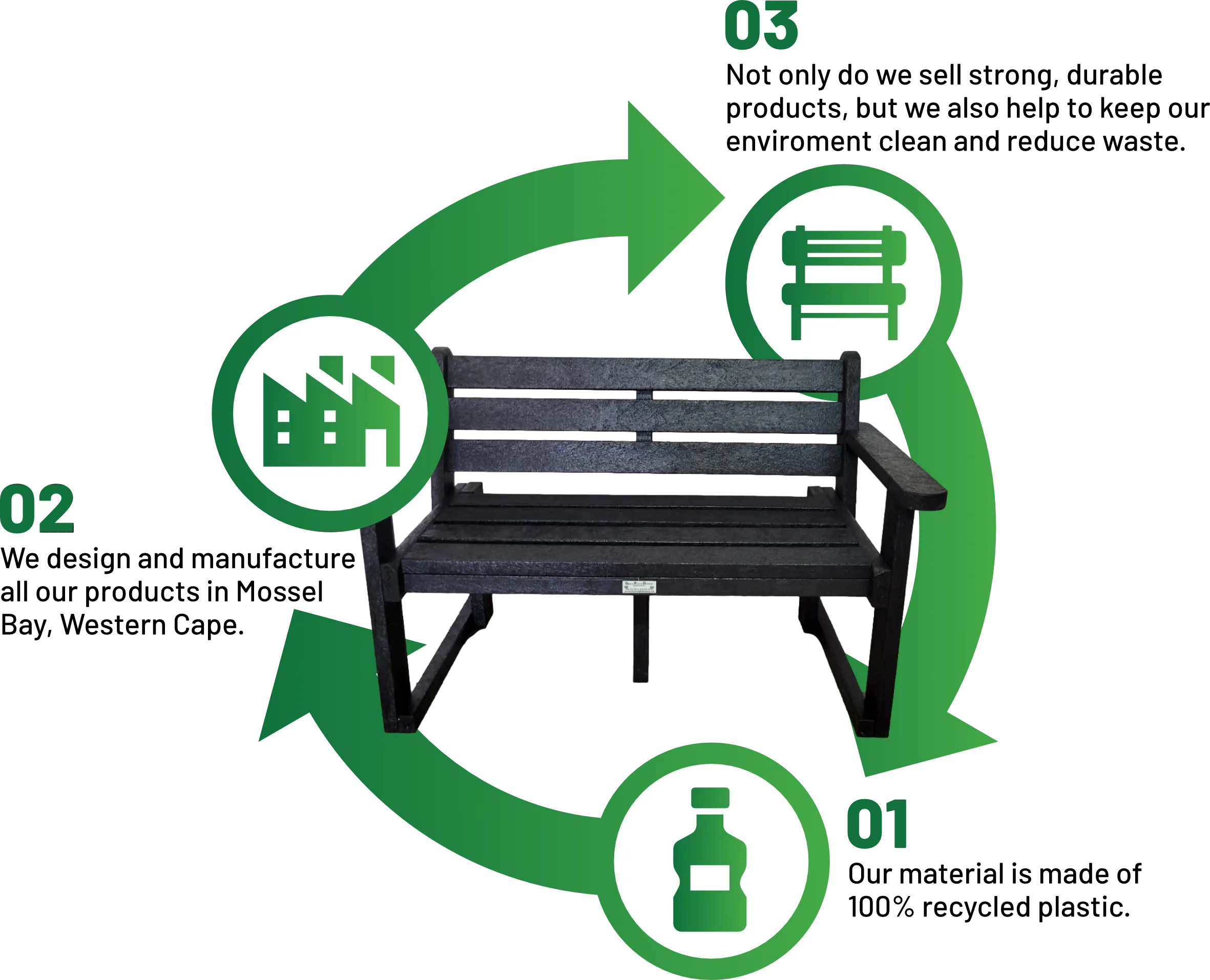 Green Plastic Designs is a company located in Mossel Bay, Western Cape, in the heart of the Garden Route. We are dedicated to providing sustainable and environmentally friendly furniture solutions for your outdoor living space. Our furniture is made from 100% recycled plastic, making it not only stylish but also eco-friendly. Each piece is carefully designed and crafted to the highest standards to ensure durability, strength, and longevity.